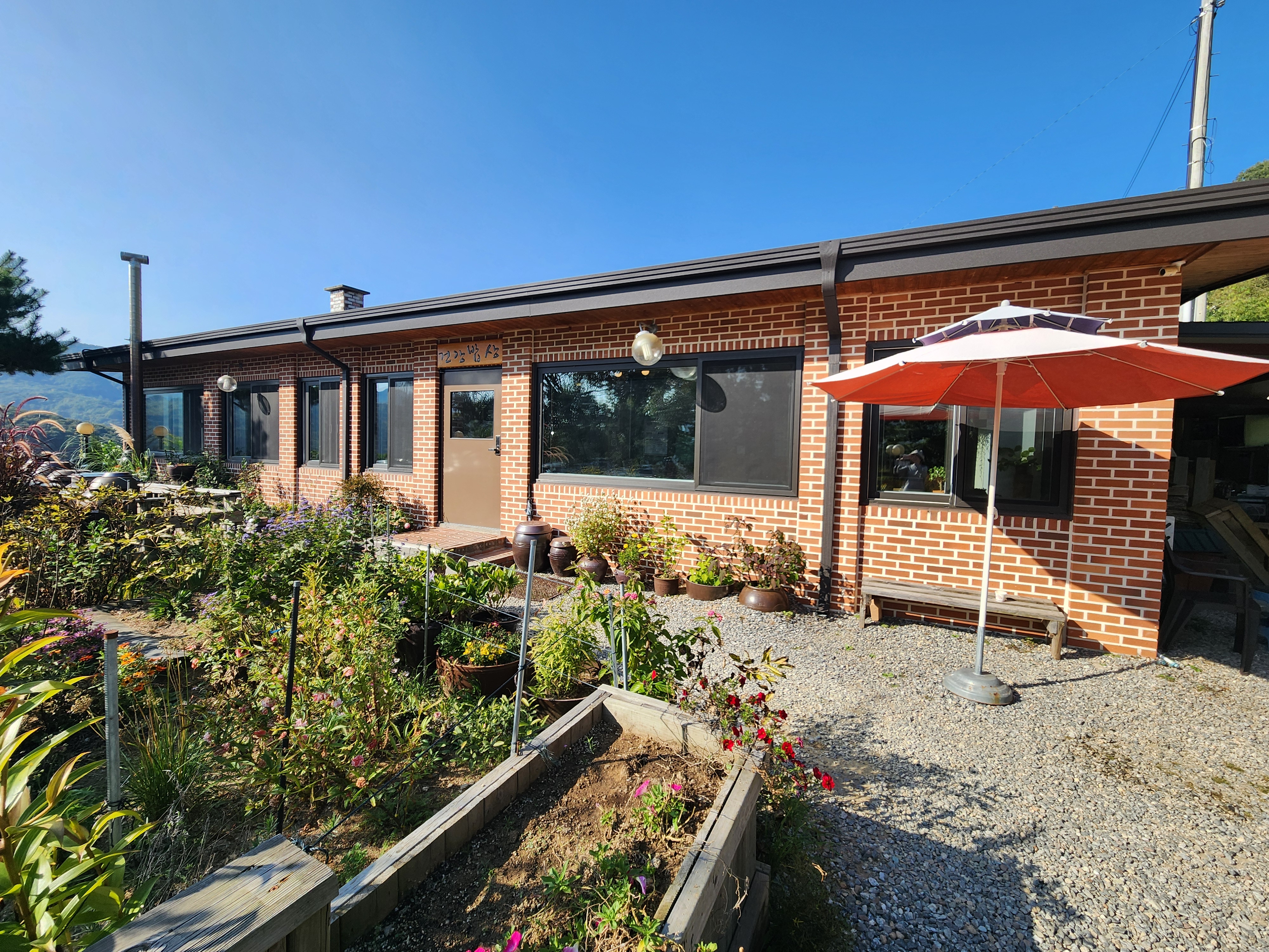 식당 앞마당에 깔끔하게 서있는 예쁜 장독대들이 정겹습니다.